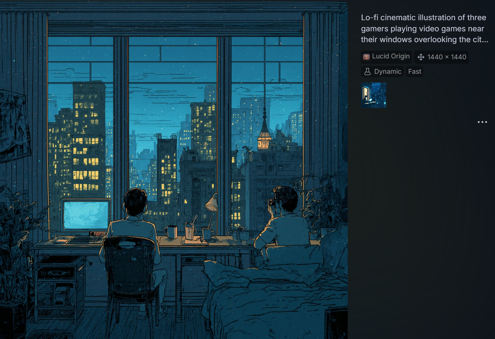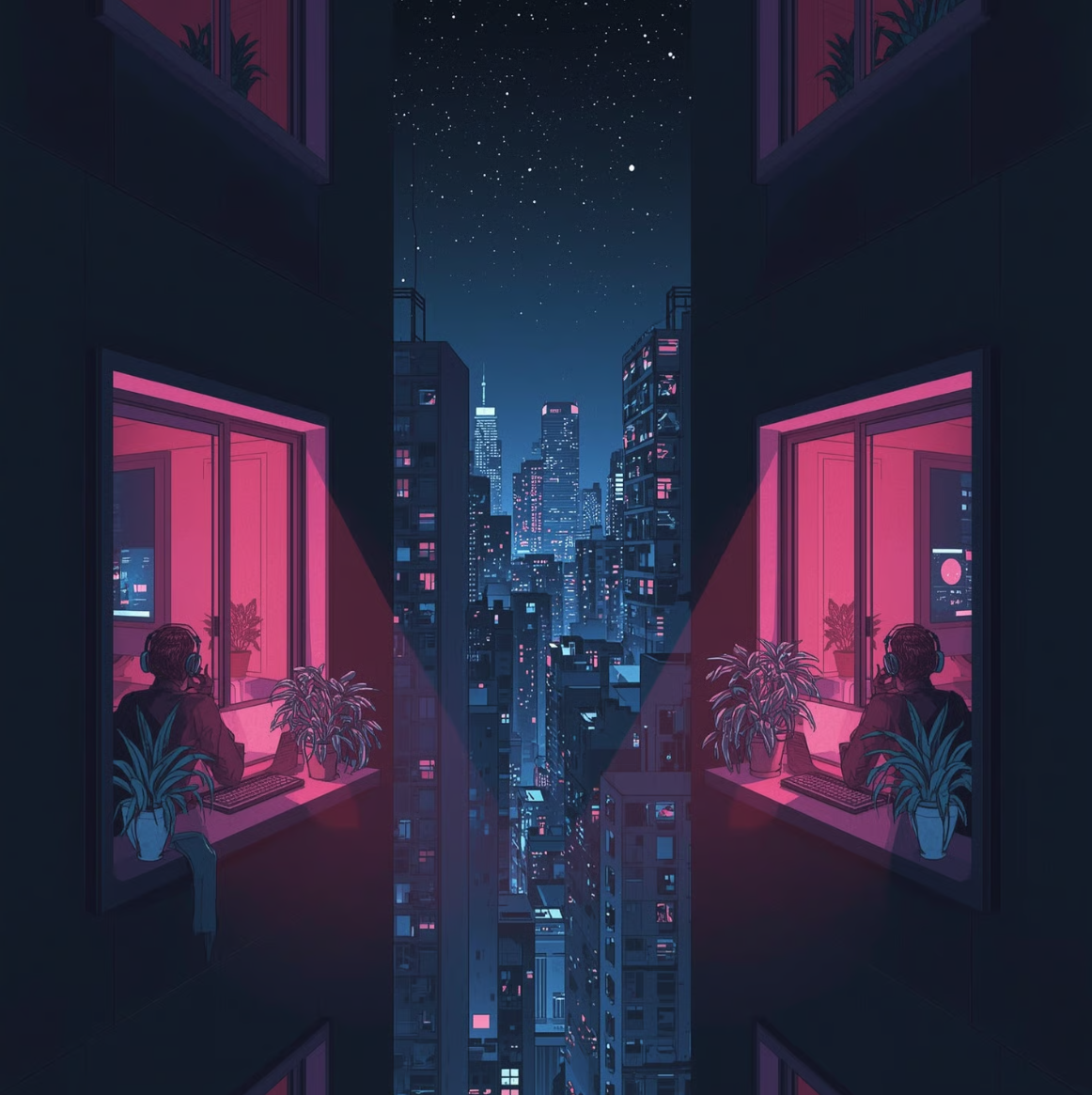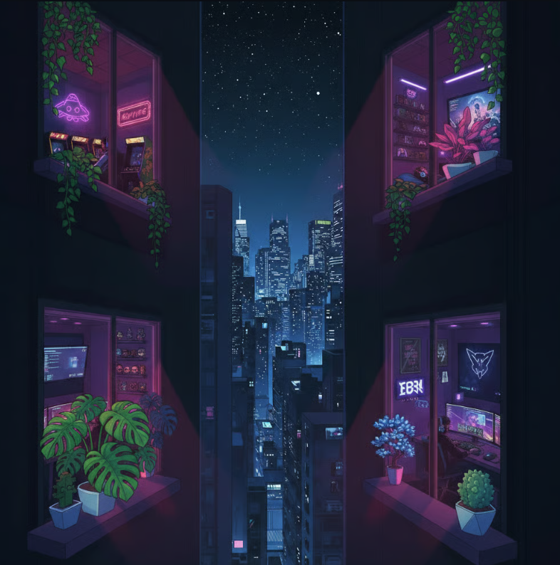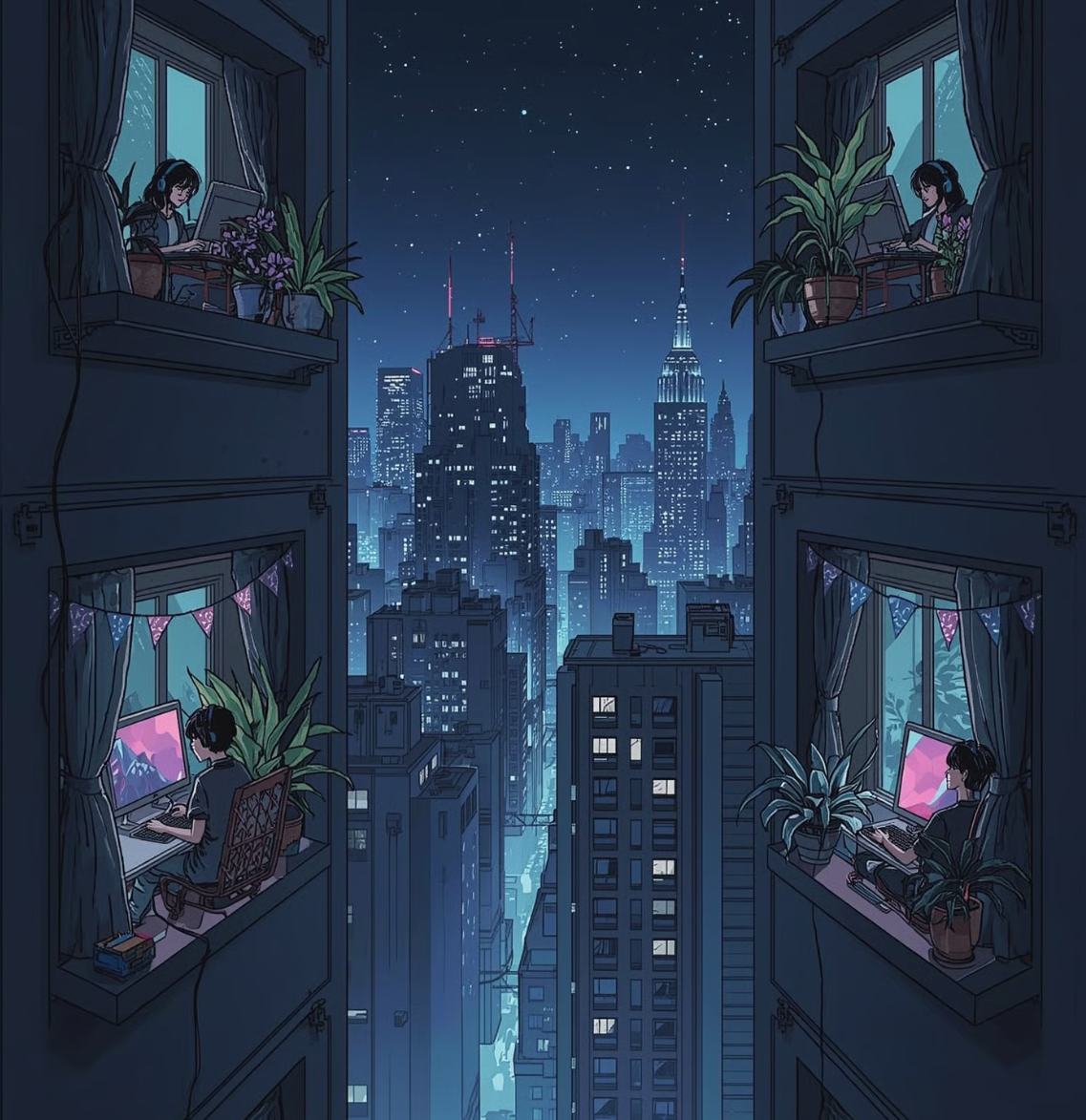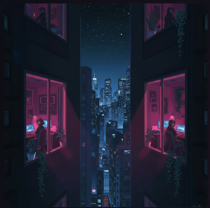 "True to the inherent nature of art, it is the human touch that refines a work to embody those subtleties and nuances only a person can provide. The specific feelings invoked by intentional creative choices. It is the reason one building or skyline "feels" more right than another. It is knowing why four souls, physically separated by the span of pavement far below or a ceiling high above, and sitting alone in the calm ambience of the night, can invoke a commentary on finding one’s place and one’s "people" amidst the conformity of society. It speaks to a peace, and connectedness found within an immersive online community, an acceptance that others may not fully understand. These are depths of perception that AI cannot truly feel. It can only mimic and reflect the surface, alluding to a humanity it does not possess."
